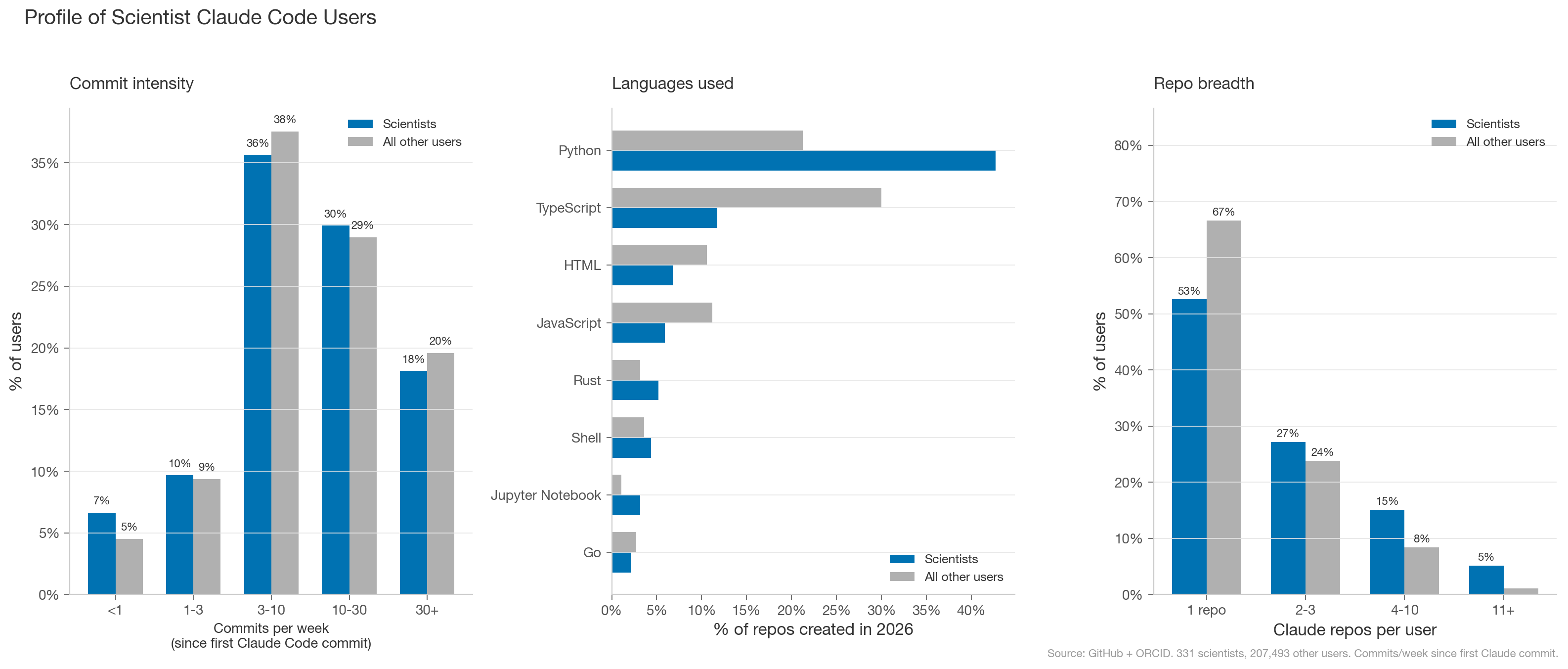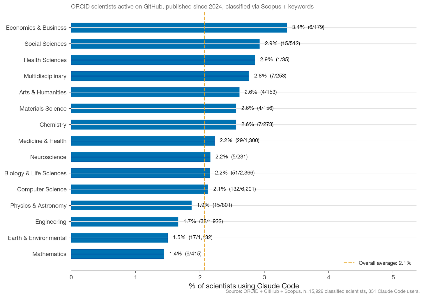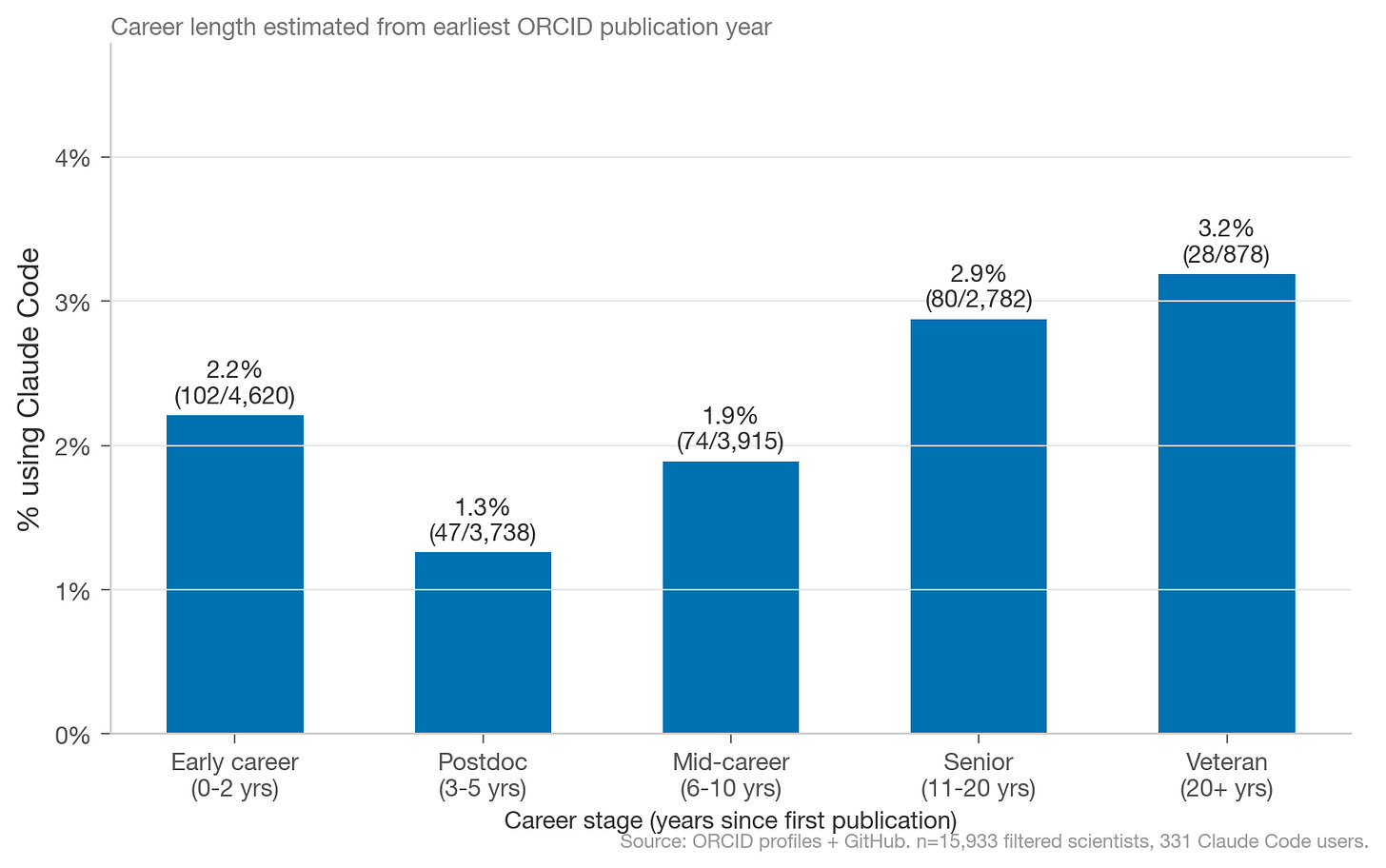 Out of ~14M total ORCID profiles, we identified 15,933 scientists (0.1% of ORCID profiles) who fit this definition. Our dataset selects for scientists who both maintain ORCID profiles and link to active GitHub accounts — a narrow slice of computationally active researchers — and the small sample of 331 Claude Code users means breakdowns by field, country, or seniority are directional, not definitive. Full Github repo here.45