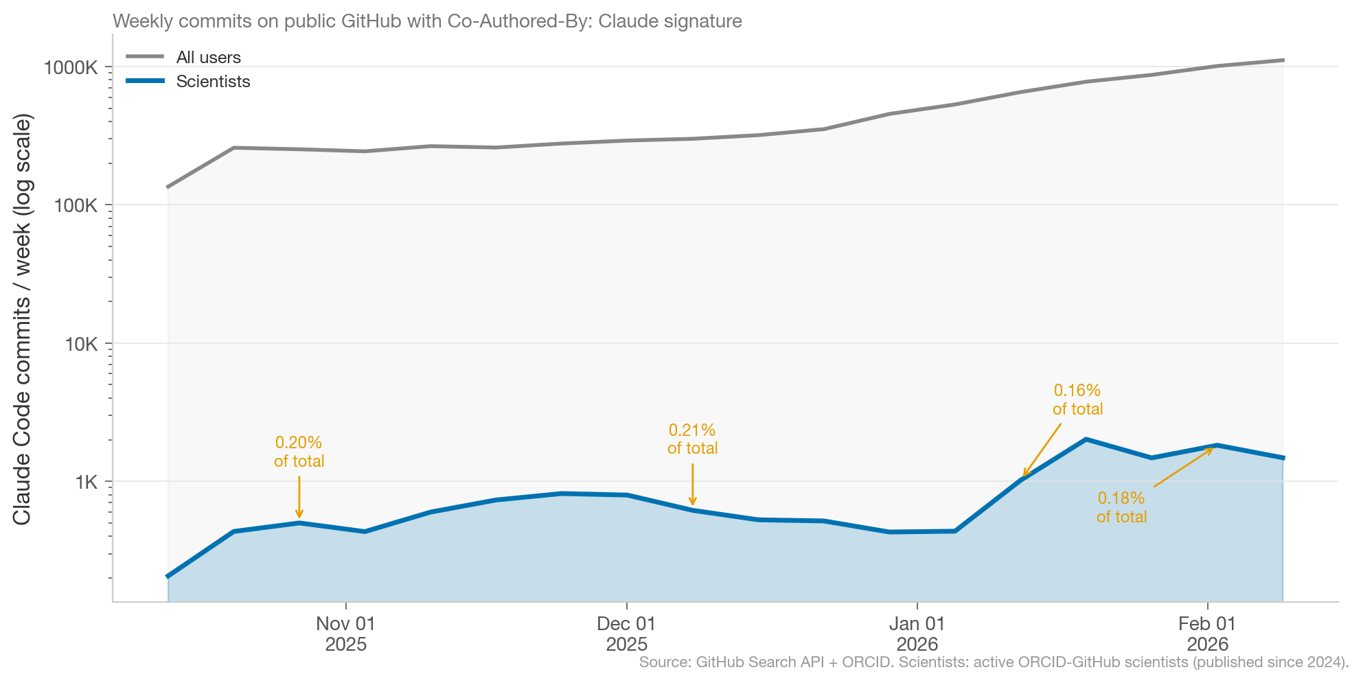What’s notable is the late January 2026 bump in scientist Claude Code commits. This suggests usage among scientists is still tied to academic cycles, but the late January bump is durable.