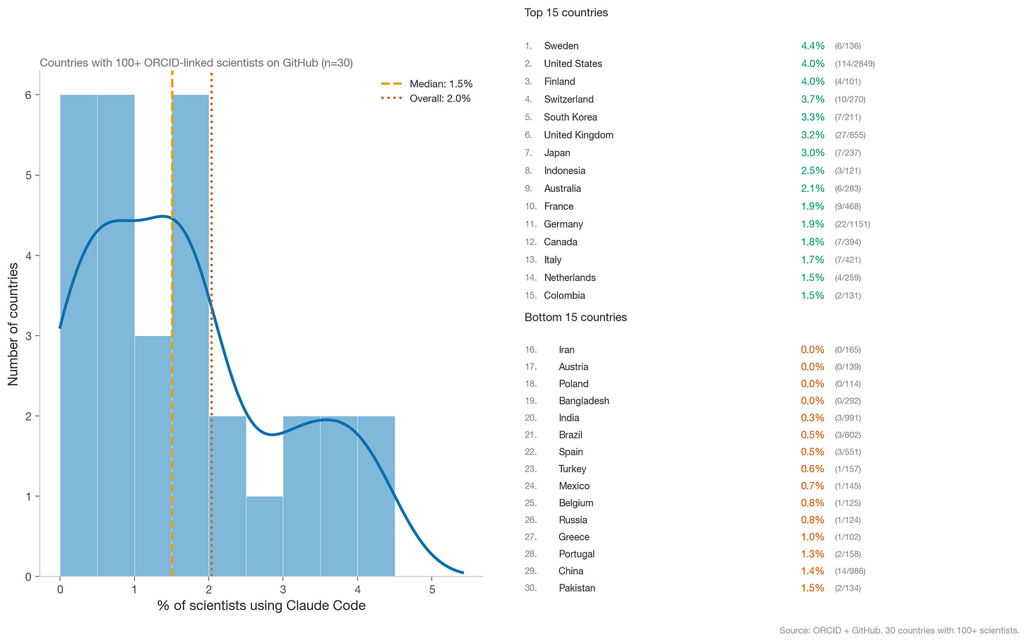A few caveats: the number of scientists using Claude Code varies by roughly 2 orders of magnitude between Sweden and the U.S., so these rankings should be treated as directional. ORCID adoption rates also vary by country, which confounds the comparison.