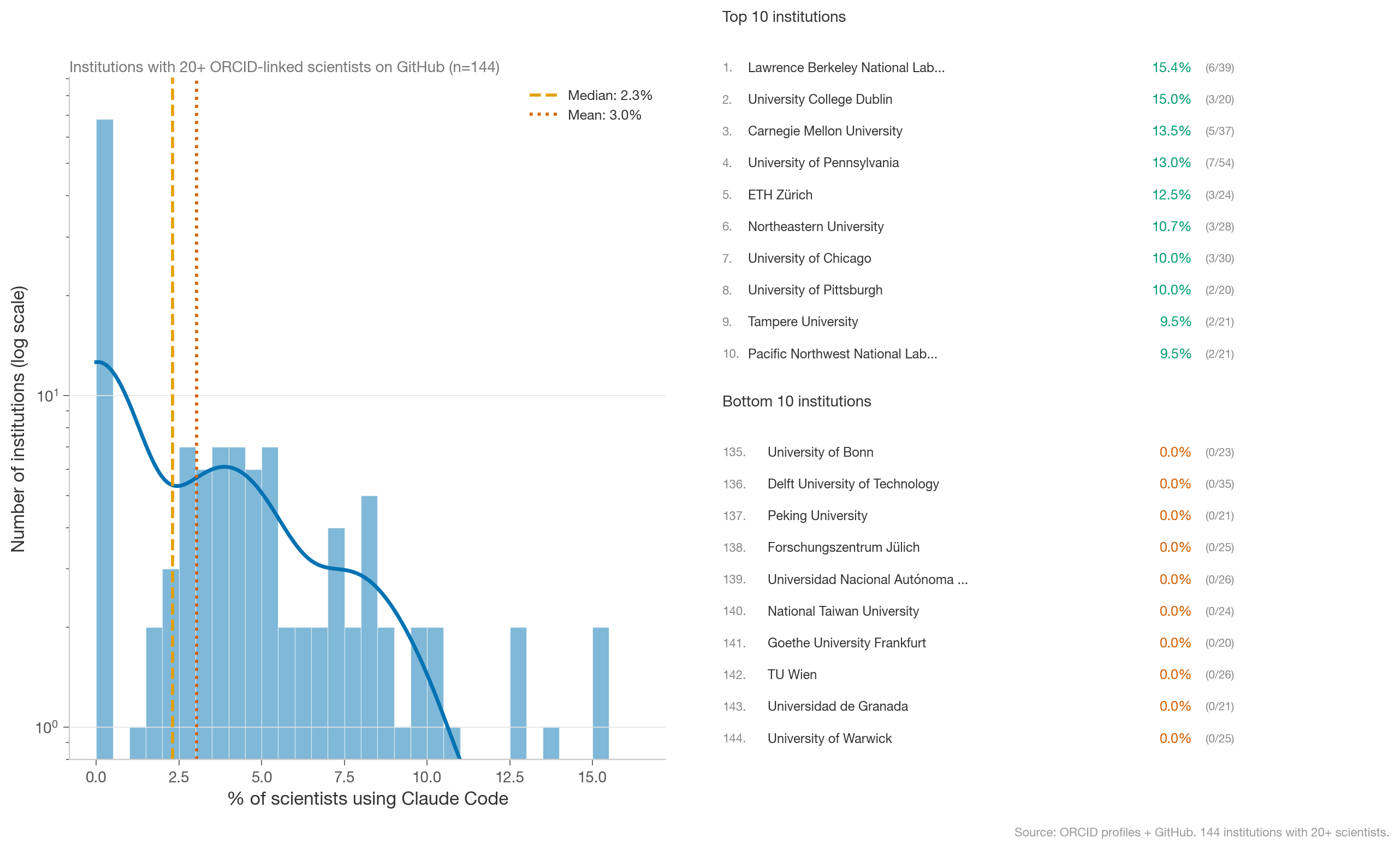 Because ORCID allows scientists to link to institutions, we can also identify institution-level adoption. After filtering for institutions with 20+ scientists linked on ORCID with Github, the vast majority of scientific institutions have zero public Claude Code users. Institutions with the highest adoption are U.S.-based Tier 1 universities.
