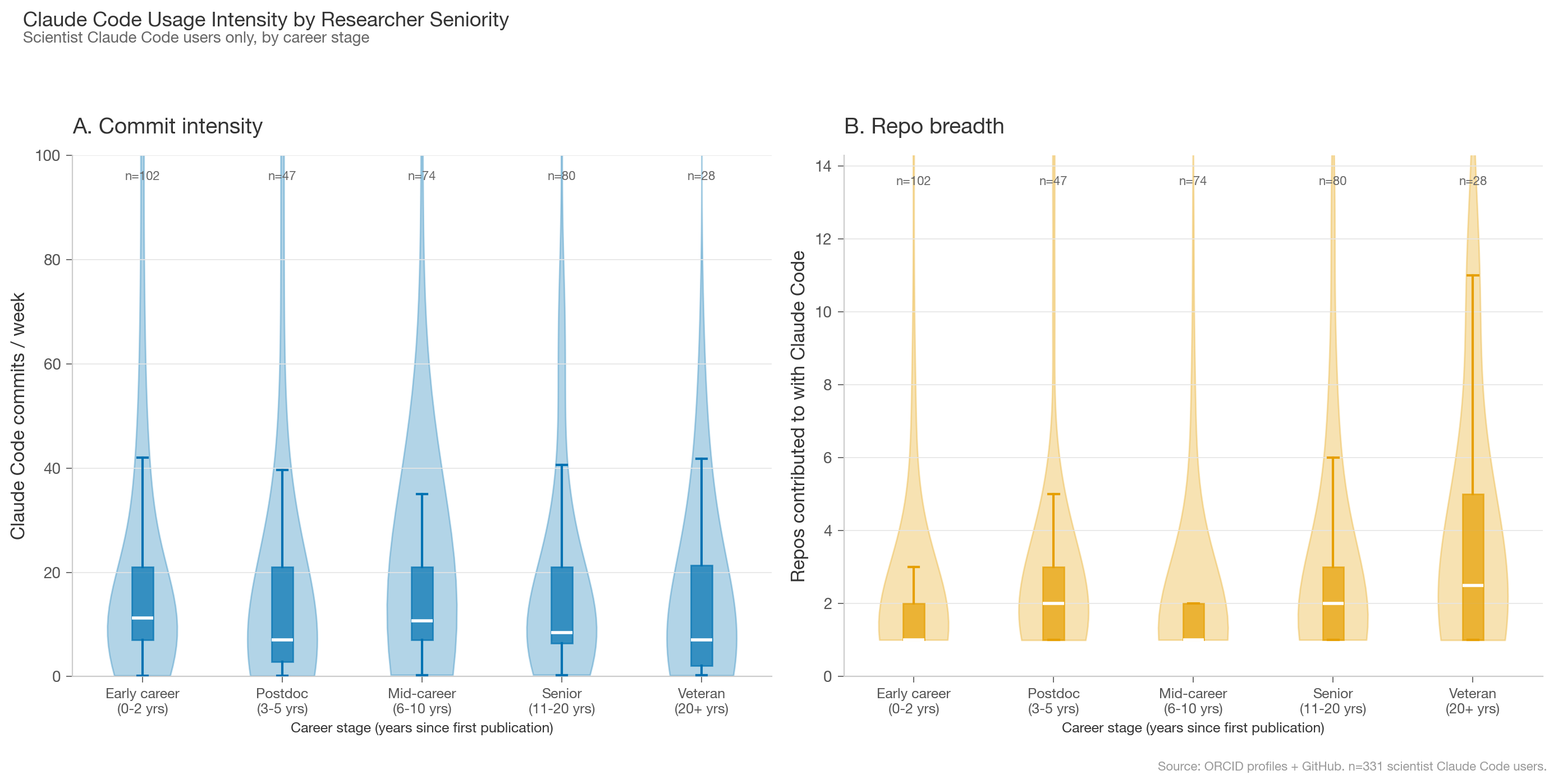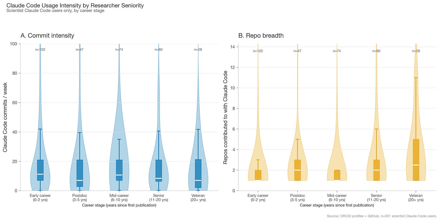 While Claude Code usage intensity is roughly the same across scientist seniority, veteran scientists are more likely to contribute across multiple repos. They were likely already involved in computational or open source work before Claude Code existed.