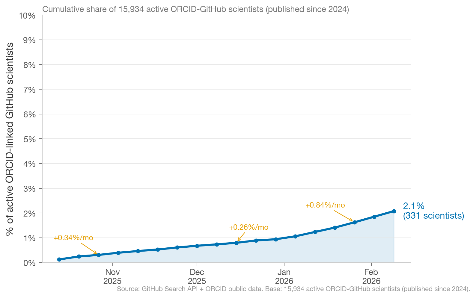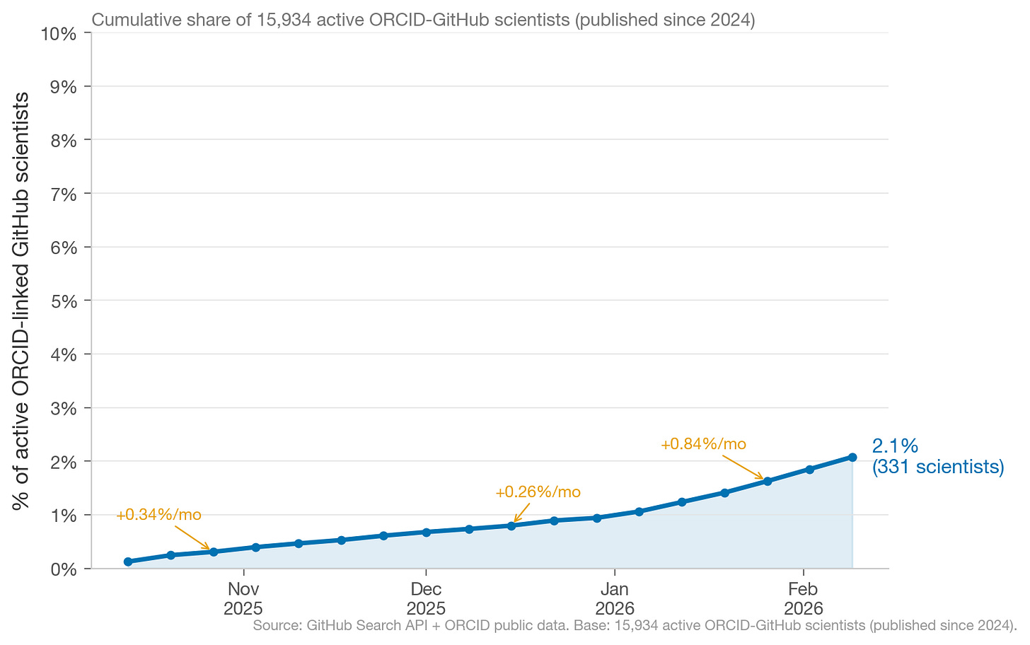 As of February 15, 2026, ~2.1% of scientists with ORCID-linked GitHub profiles use Claude Code. Extrapolating from current growth rates, we’d expect ~10% of “scientists” in our dataset to use Claude Code by end of 2026.